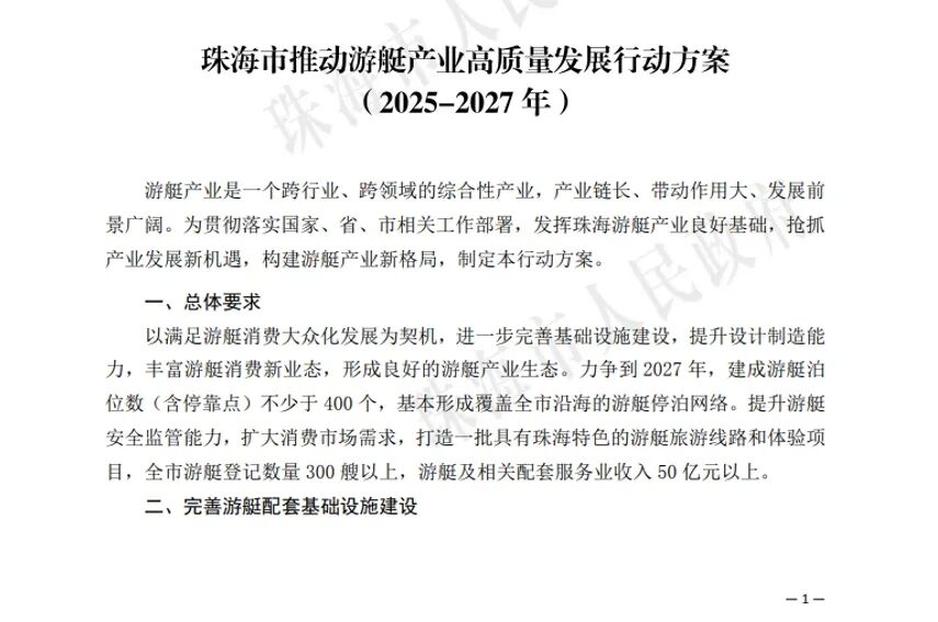 新年伊始,游艇产业再次迎来利好消息。1月5日,珠海市人民政府办公室发布了关于印发《珠海市推动游艇产业高质量发展行动方案(2025-2027年)》的通知(珠府办函〔2025〕112号)。