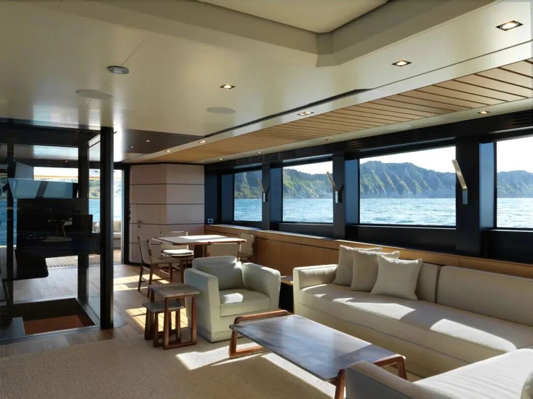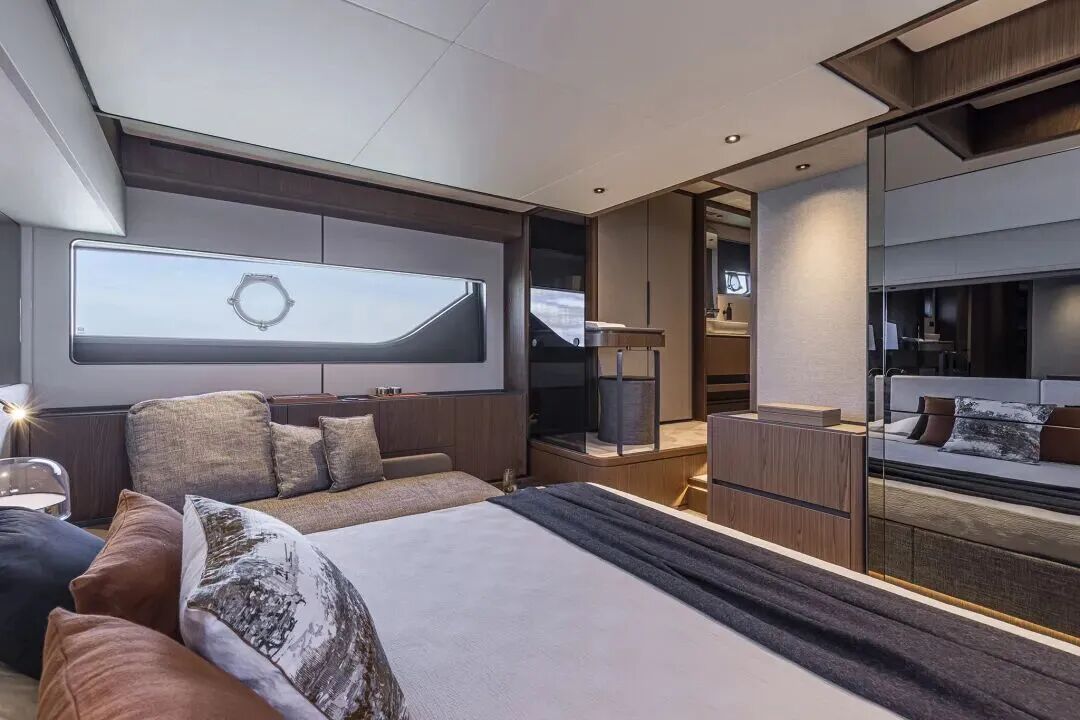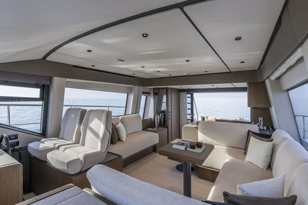 主要创新点包括主甲板与下层甲板多样的定制选项,其中下层甲板提供了两种三舱室布局方案。在选材方面,优质木材与布艺的混搭,在精致优雅的风格中传递出整洁理性的设计感,是现代奢华的缩影。法拉帝580提供经典与当代两种内饰风格。前者采用温暖质朴的元素,而后者则选用明亮的木材和面料,设计灵感来自大海。两种风格都秉持明确无误的意大利制造风格。