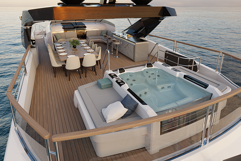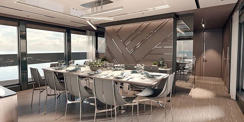新款 100 Yacht 将在船艏设置娱乐空间,随时随地为您带来惊喜与快乐。该船型预计于 2022 年首发。悉心打磨每个元素,此般精致奢雅一般都出现在定制款的超级游艇上。100 Yacht 的线条优雅而有力,构造恢弘。风格华丽优美,设有隐蔽的私人露台、私密的日光浴区、可通往前甲板的流畅飞桥区。开放式内饰布局精巧细腻,并设有宽裕的“海滩俱乐部”区域。独特的主甲板、通透的沙龙和豪华舱室,展现出新的设计方向和材料选择,优雅的内饰定能让船东沉醉其中。纹理层次丰富,家具和面料搭配巧妙,共同营造出经典考究的精致美感。